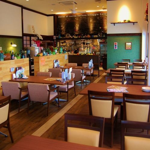 【駐車場も有り!】お洒落で木目を基調とした店内。まるで本場イタリアにいるような感覚を味わえます。店内に光るスポットライトに照らされた黒板には、その日仕入れたイタリア野菜が…、ゆっくりと楽しい時間をお楽しみ下さい。